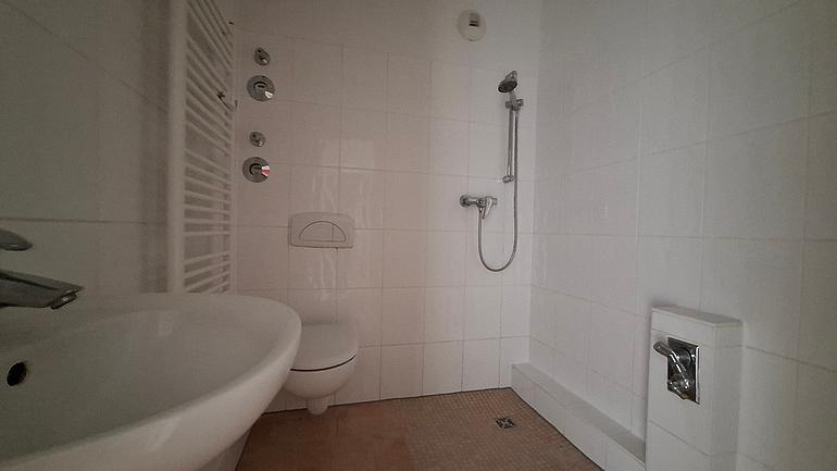 Das moderne Badezimmer ist mit einer bodengleichen Dusche ausgestattet und ermöglicht so einen sicheren, schwellenfreien Alltag.