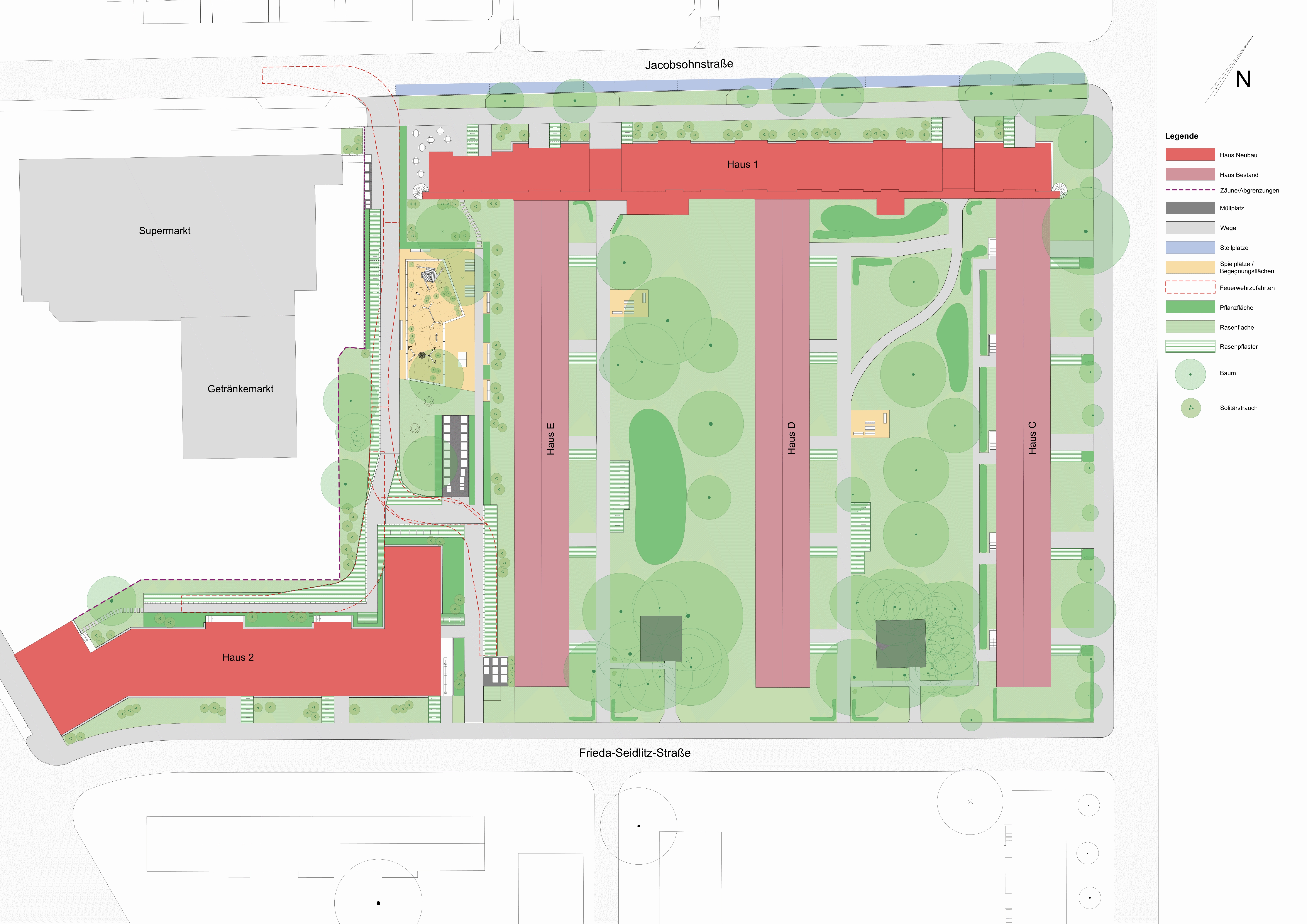 In der Jacobsohnstraße und Frieda-Seidlitz-Straße errichtet die GESOBAU jeweils einen Neubau mit insgesamt 123 Wohnungen. Die beiden Gebäude werden mit einem Fahrstuhl sowie barrierearmen und barrierefreien Wohnungen mit einer Größe von ca. 40 m² bei einer 1-Zimmer-Wohnung und bis zu 93 m² bei einer 5-Zimmer-Wohnung ausgestattet. Das Haus an der Jacobsohnstraße wird dabei die kleineren 1- bis 2-Zimmer-Wohnungen beherbergen, im Haus an der Frieda-Seidlitz-Straße finden die familiengerechten größeren Wohnungen Platz. 75 % der Wohnungen werden an Haushalte mit einem Wohnberechtigungsschein (WBS) zu einer Nettokaltmiete ab 7,00 €/m² vermietet. Die übrigen Mieten basieren auf den Vereinbarungen der ergänzten Kooperationsvereinbarung.